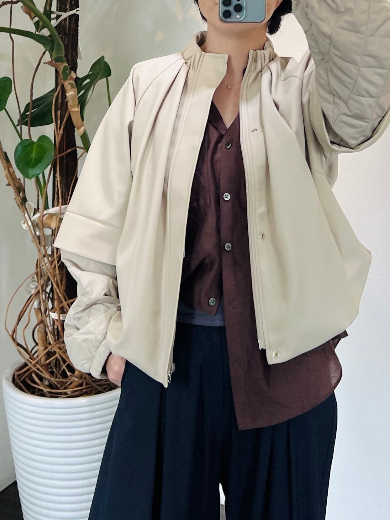 ゆったりとしたボリューム感とショート丈が特徴的で、袖が取り外し可能な2wayジャケット
