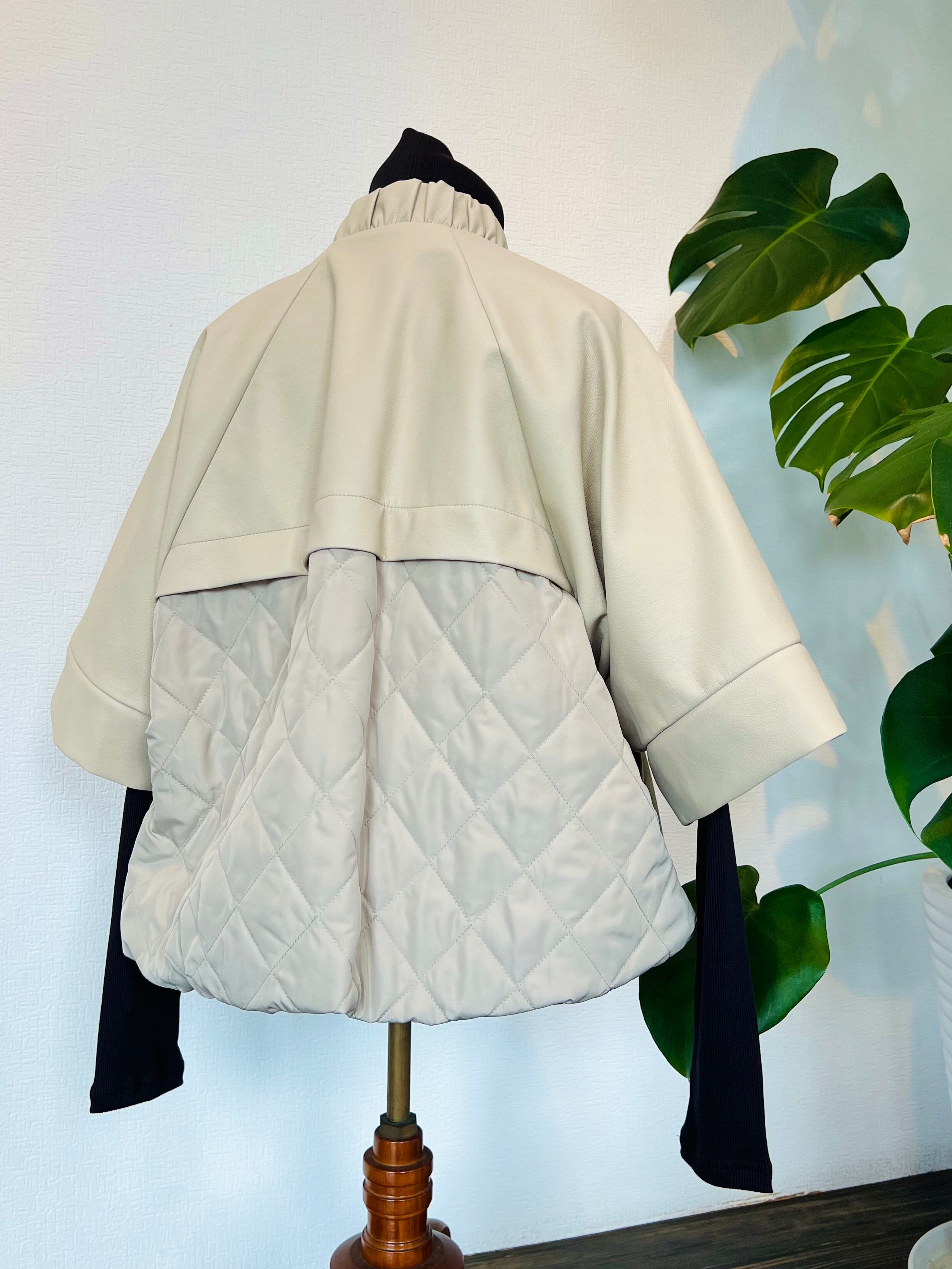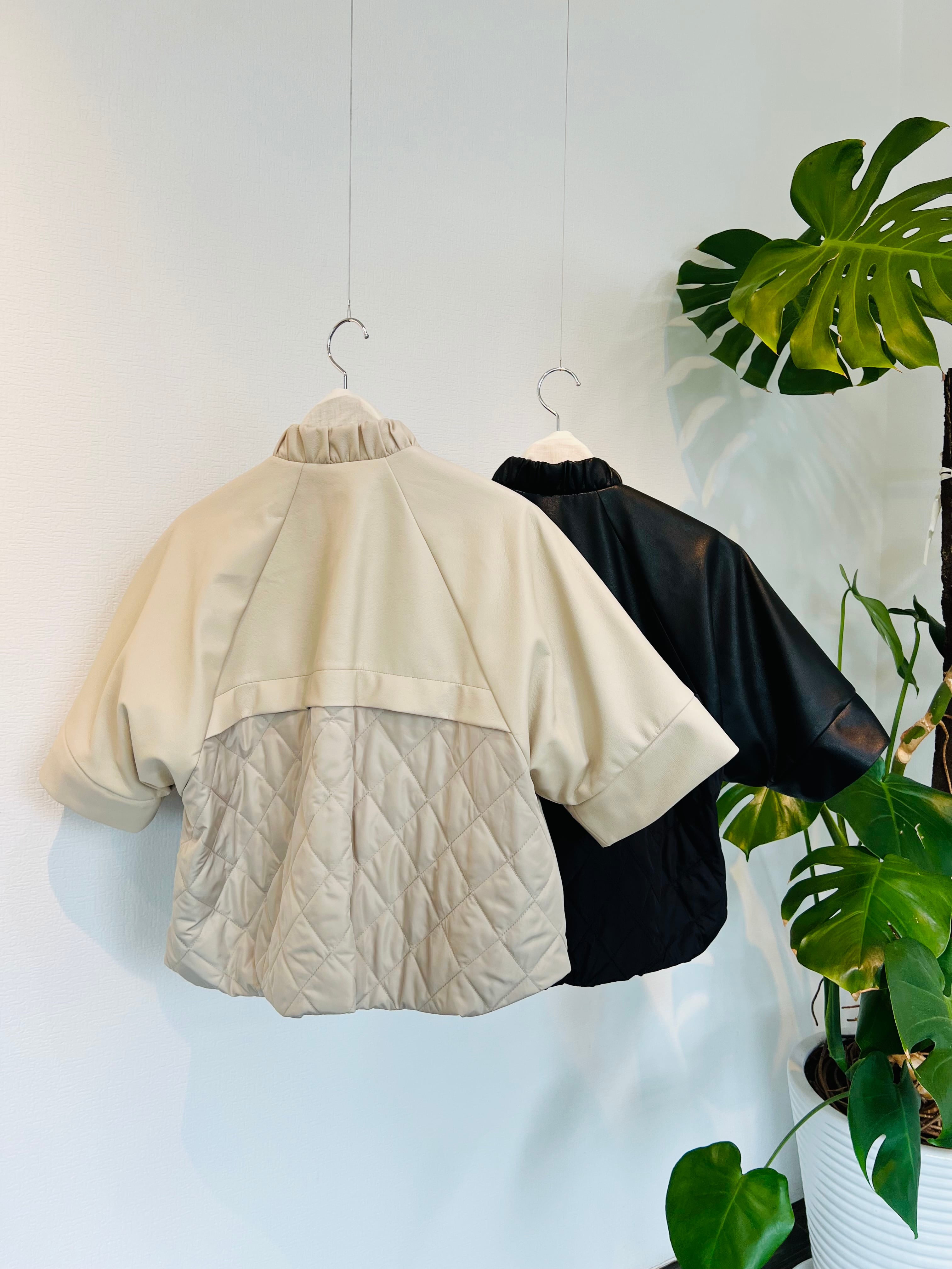 です。しなやかなフェイクレザーが洗練された印象を与え、袖と背面のキルティングデザイン