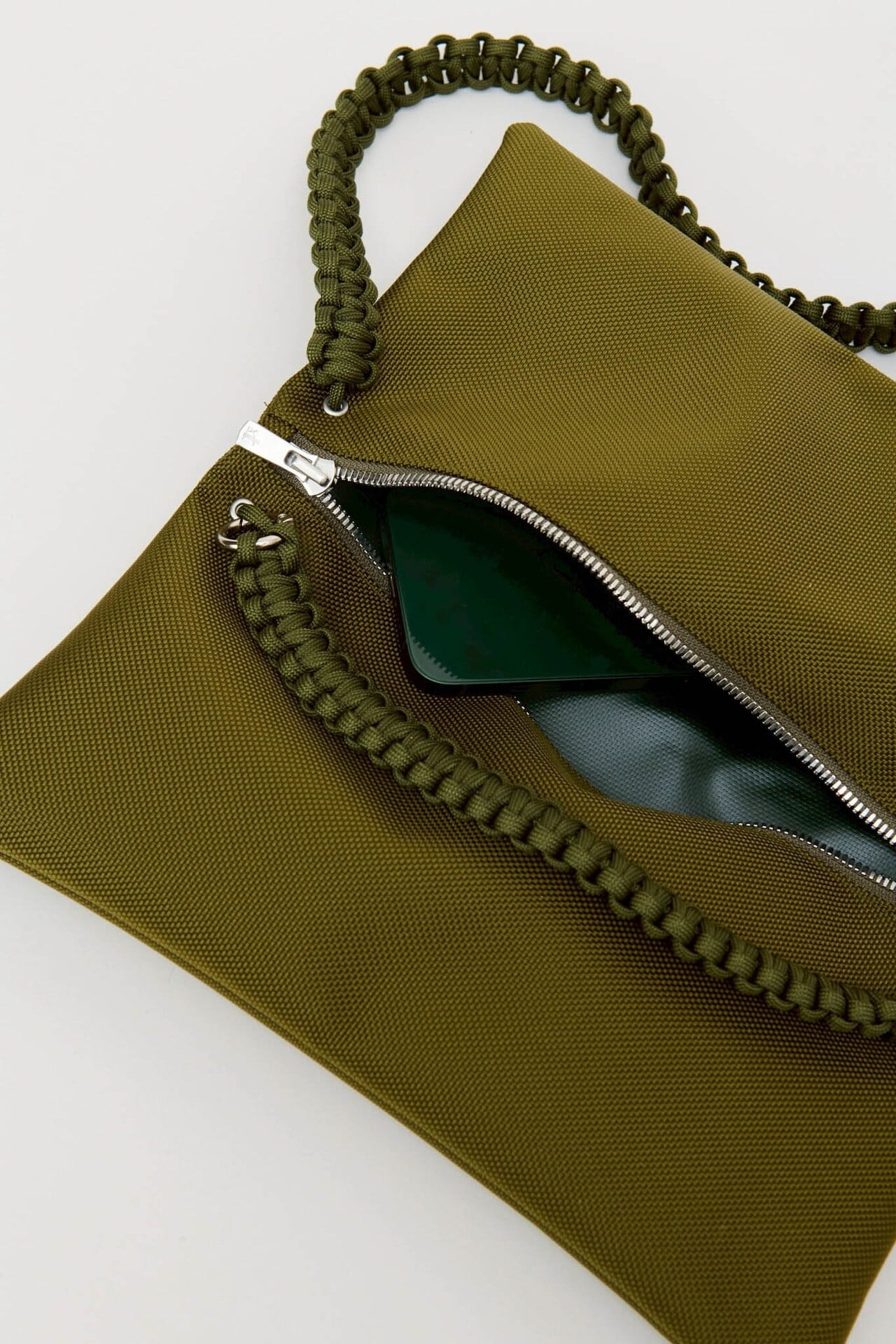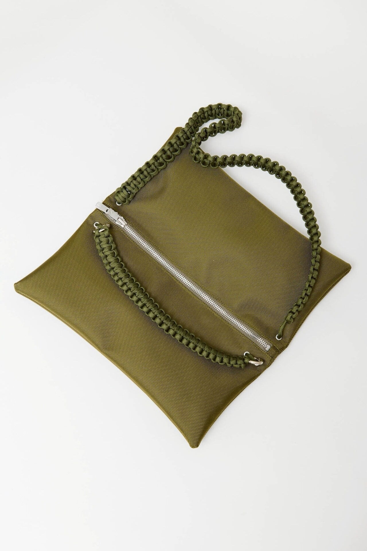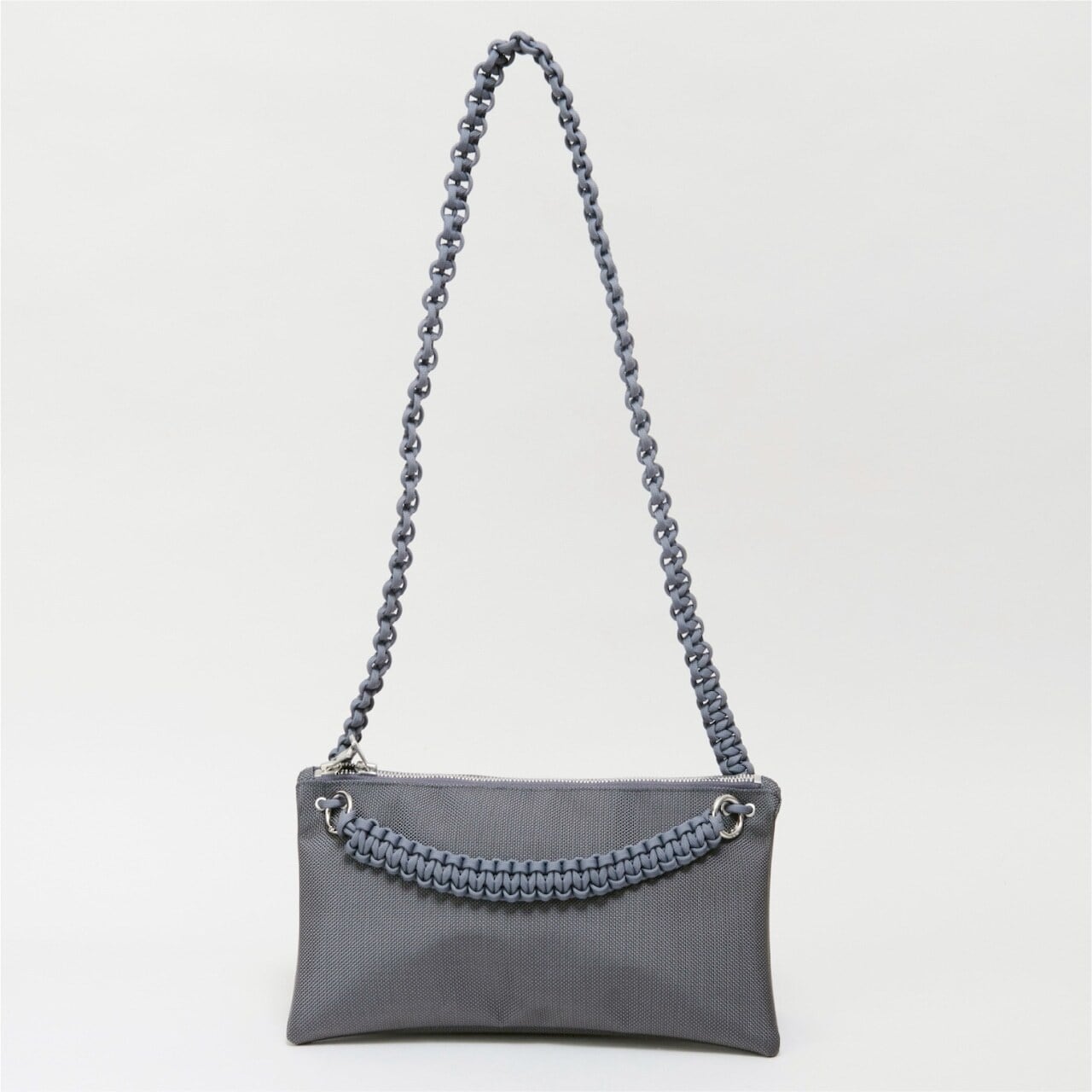 さらに、合計13mの紐をすべて手編みしたこだわりのハンドルや、自由な位置で開閉できるダブルファスナーを採用。二つ折りにすると中央に仕切りが生まれる構造で、デザイン性と優れた実用性を兼ね備えたバッグです。